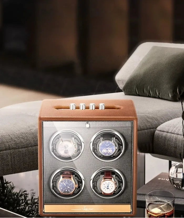 Hộp xoay đồng hồ mô phỏng chuyển động tự nhiên của cổ tay, nhẹ nhàng xoay đồng hồ tự động để giữ cho nó chạy khi không đeo. Chuyển động nhất quán này giúp các cơ chế bên trong hoạt động và được bôi trơn tốt, duy trì độ chính xác và tuổi thọ.